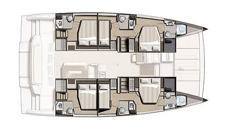 Bali 4.8 в 6-каютной версии - современный катамаран высокого класса, рассчитанный на комфортное путешествие большой компанией. Главная особенность модели - фирменная концепция open space: подъемная задняя дверь салона объединяет интерьер и кормовой кокпит в единое открытое пространство, делая общие зоны особенно удобными для жизни на борту. Планировка с 6 гостевыми каютами, включая две каюты с двухъярусными кроватями, позволяет гибко разместить на борту разный состав гостей и делает катамаран практичным вариантом для семейных и дружеских путешествий. Дополнительный комфорт создают кондиционер, опреснитель, холодильник, кофемашина, ледогенератор и барбекю в кокпите.