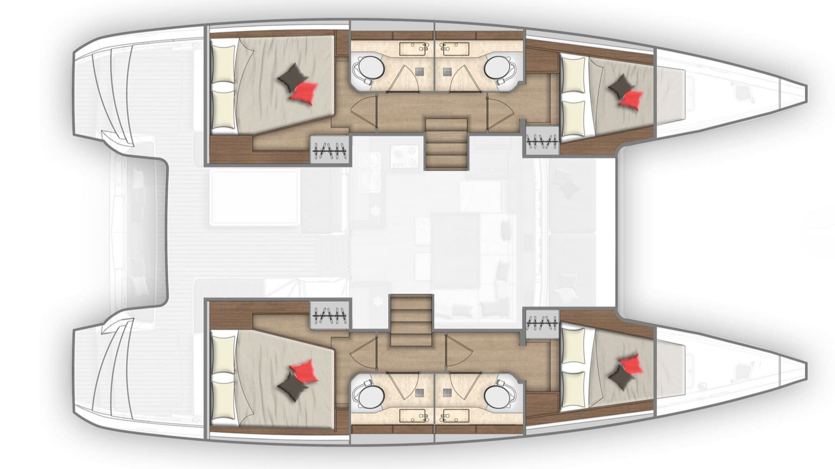 Lagoon 42 - современный катамаран для комфортного путешествия небольшой компанией в Турции. Это один из самых доступных вариантов, но при этом по оснащению он закрывает большинство запросов на комфорт и автономность. На борту 4 гостевые каюты и 4 санузла, размещение до 8 гостей, плюс отдельная каюта для экипажа в форпике. Такой формат удобен для компании друзей или нескольких пар: у каждого есть личное пространство, а общие зоны остаются свободными и не перегруженными. Lagoon 42 хорошо укомплектован для жизни на воде и стоянок в бухтах. Есть инвертер и генератор, опреснитель, кондиционер в каютах и общих зонах. Это означает, что вы меньше зависите от марин и можете планировать неделю гибко, выбирая красивые стоянки и комфортный режим отдыха.