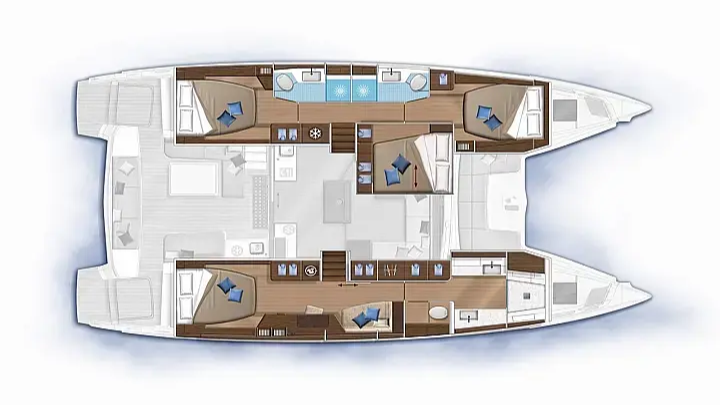 Lagoon 50 - просторный катамаран высокого класса с комфортной 4-каютной планировкой, в которой удачно сочетаются приватность, удобство и хорошо организованное общее пространство на борту. На яхте предусмотрены 4 гостевые каюты: мастер-каюта, две стандартные каюты и одна каюта среднего размера. У мастер-каюты - собственный большой санузел, что делает это размещение особенно комфортным и приватным. Две стандартные каюты и каюта среднего размера обслуживаются двумя общими гостевыми санузлами. На борту также есть отдельная каюта для шкипера с собственным санузлом. Дополнительный уровень комфорта обеспечивают гидравлическая платформа, генератор, кондиционер, опреснитель и ледогенератор - все, что важно для спокойного и хорошо организованного отдыха на воде.